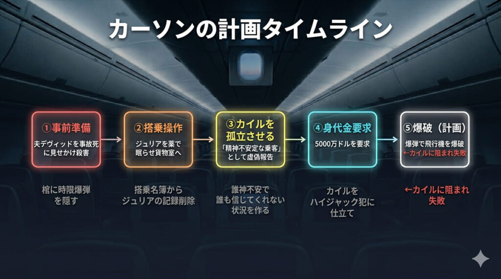 カーソンはカイルの夫デヴィッドを事前に「事故死」に見せかけて殺害し、棺に爆弾を隠した。デヴィッドが死ぬことで、カイルが飛行機に棺ごと乗り込む動機が生まれる——という計算だ。