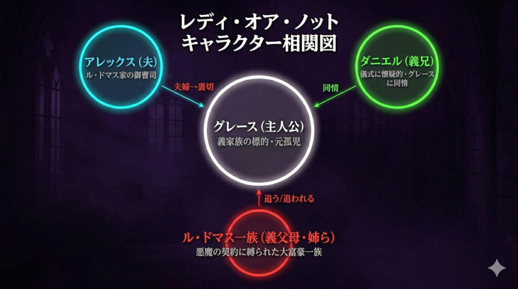 まずは複雑な義家族関係を整理しておきましょう。物語を追う上で、ル・ドマス家の人間関係を把握することが重要です。