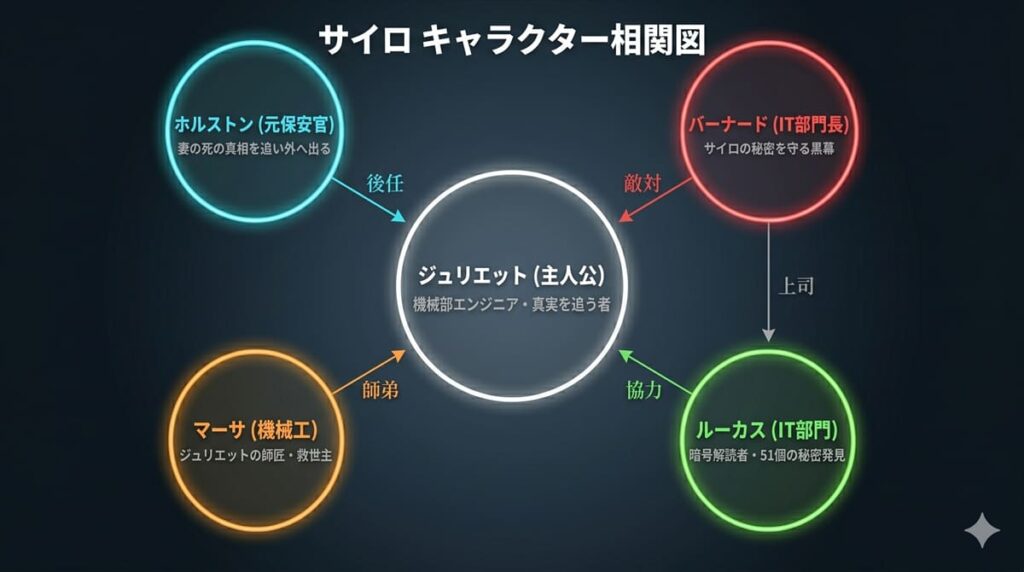 サイロには多くのキャラクターが登場するため、まずは主要人物の関係性を把握しておきましょう。