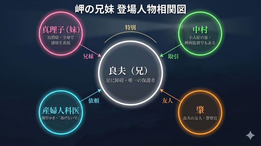 - 良夫(兄)(松浦祐也)——足に障碍を抱えリストラされた兄。妹の唯一の保護者であり、同時に最大の加害者でもある存在。